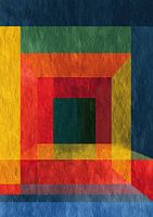 Deze abstracte compositie valt op door haar strikt horizontale indeling in krachtige kleurbanden. Rechthoekige en vierkante segmenten in donkergroen, oranjerood, dieprood en blauw vormen een ritmisch patroon met scherpe, hoekige overgangen. De grove, korrelige textuur en zichtbare penseelstreken geven de verzadigde kleuren een tactiele…