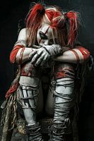 Gehuld in haveloze, met bloed besmeurde kleding hurkt een vrouwelijke horrorharlekijn in een schaduwrijke hoek, die zowel verdriet als dreiging belichaamt. Haar opvallende gezicht is grimmig wit geschilderd met spookachtige rode markeringen, terwijl haar haar, gestyled in speelse paardenstaarten, barst van de levendige rode tinten. Met haar knieën stevig op elkaar geklemd en een verloren uitdrukking straalt ze een diep gevoel van isolatie uit.
