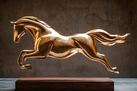 Een kunstwerk die de essentie van kracht en de dynamische beweging van een paard vastleggen in een minimalistische maar krachtige weergave in een gouden uitvoering.