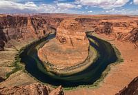 Horseshoe bend, een bekent beeld uit Amerika. Enorme rotsformaties die zijn uitgesleten door de Colorado rivier. Die er prachtig omheen loopt, als een hoefijzer. Volledig gevuld liggend beeld met natuurtinten.