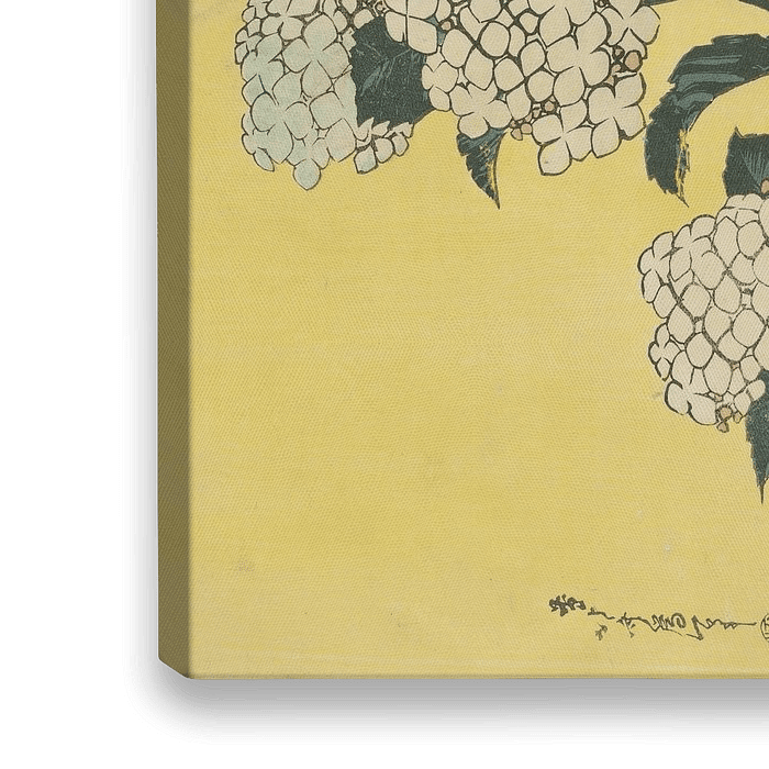 Hier zien we enkele hortensia's en een zwaluw. De hortensia wordt door Hokusai bijzonder gewaardeerd. Deze bloem, die symbool staat voor dankbaarheid (of verontschuldiging), verandert namelijk van kleur afhankelijk van de zuurgraad van de grond waarin hij wordt geplant. Zij kan bijvoorbeeld indigoblauw worden, een kleur die Hokusai bijzonder dierbaar was.