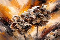 Een dynamische compositie toont gedroogde hortensiabloemen tegen een levendige, abstracte achtergrond. Warme tinten mengen zich om een gevoel van beweging en energie te creëren.
