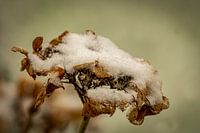 Macrofoto van een Hortensia in de winter bedekt met sneeuw