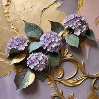 Een digitaal modern kunstwerk van pastel kleurige hortensia's op een achtergrond in verschillende tinten paars en gouden verf. In goud zijn barokke krullen aangebracht voor een sierlijk accent in uw interieur.