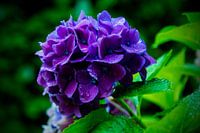 De mooie kleuren van deze blauw paarse Hortensia lijken nog dieper na de regen. Druppels op bloemen en bladeren hebben een soort magisch, sierlijk effect.