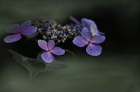 De paarse bloemen van deze hortensia vormden een fraai krans om de nog niet ontloken bloemen. Ik heb een dromerige sfeer aangebracht door de achtergrond wat te vervagen en de kleur aan te passen