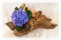 Close-up van een blauwe Hortensia de bloem op een stuk hout.