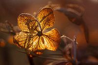 Close-up van de uitgebloeide bloem van de Hortensia in de warme gloed van de laagstaande herfstzon waarbij het licht door het blad valt.