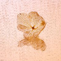 Een prachtige close-up van het skelet van een hortensiablaadje. Er is een mooie reflectie zichtbaar tussen allemaal kleine waterdruppeltjes. Er is gebruik gemaakt van zachte pasteltinten. De foto straalt kracht en fragiliteit uit door het skelet van het blaadje, de waterdruppels en het kleurgebruik.