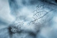 Sfeer en romantiek in deze macro-foto van uitgebloeide Hortensia omringt met een bokeh van blauw/grijze pastelkleuren.