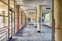 Verlaten hospitaal in België. Je ziet de gang met aan weerszijden ramen waar de ruiten uit zijn. Ook graffitiop de muren en pilaren.