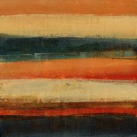 Dit vierkante abstracte werk in acryl op papier bestaat uit een reeks gelaagde, onregelmatige strepen in leigrijs en warm beige, oker en rijk omberbruin. Het is gemaakt op een koele zomeravond met goede muziek. De rustieke, harmonieuze kleuren verwarmden mijn hart en ziel.