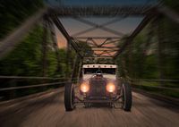 Bewerking van een hot rod, gefotografeerd op een brug aan de route 66. De snelheid wordt mooi weergegeven in de bewegings onscherpte.
