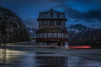 Avond foto van het iconische maar leegstaande hotel op de Furka Pass in Zwitserland.