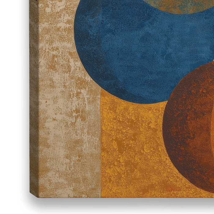 Wat je eerst zou opvallen zijn textuur en contrast. De grootste cirkel bovenin is goudgeel, met een gebarsten, bijna korrelige laag die licht vangt; daaronder een diepe, bijna mattige blauwe cirkel die koel en solide oogt; en vooraan een warme oranje-rode cirkel met een donkere halve schaduw die volume suggereert. Op linksboven een kleine gouden orb als subtiele herhaling van het grote goud, een soort echo. De verticale blauwe kolom in het midden geeft het schilderij architectuur, en de fijnkorrelige beige-achtergrond met lichte craquelé voegt tactiele diepte toe. De randen van de vormen zijn precies maar niet klinisch: er zijn zachte overgangen waar lagen elkaar raken, en ruwe textuur waar de verf is opgebouwd — dat maakt dit abstract schilderij ook een voelbare ervaring, zelfs op afstand.