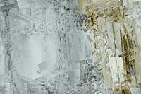 Een digitale compositie met bruin en goud kleurig, grijs en wit. Een indruk van verbrijzeld glas, beweging, transformatie en een stille uitbarsting. Kubisme, technologie.