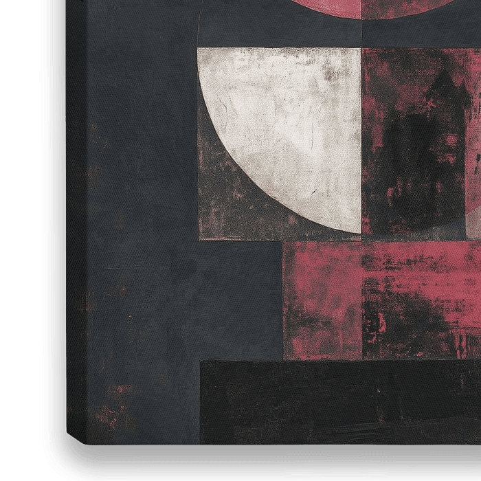 Hotel kunst - In één oogopslag oogt dit abstract schilderij als een rustige, precies opgestelde hemelsteen die neerdaalt op een gebouw. Het werk speelt met grote, eenvoudige vormen: bovenaan een bijna volledige cirkel in een verweerde roodoranje toon, daaronder een subtiele compositie van halve cirkels en rechthoeken die elkaar raken en…
