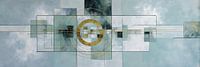 Hotel wanddecoratie - Dit werk voelt als een rustige hartslag in een luxe lobby: een breed, horizonaal abstract schilderij waarin een goudkleurige cirkel het midden vormt, omgeven door subtiele concentriche ringen en strakke horizontale lijnen. De compositie ademt rust en orde zonder kil te worden; het is een geometrisch schilderij dat…