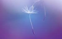 Twee pluisjes van de paardenbloem dwarrelen naar beneden door een lichte wind. Een tedere aanraking, hou me vast!