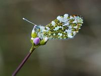 Pinksterbloem met vlinder. Een voorjaarsvlinder, het oranjetipje op een pinksterbloem. De oranjetipjes zijn dagvlinders en Nederland te vinden in april, mei. Het mannetje van deze soort valt op door de grote oranje vlek in de voorvleugelpunt; bij het vrouwtje ontbreekt deze karakteristieke vlek. De onderkant van de achtervleugel is geelgroen gemarmerd. Hier zit de vlinder op zijn waardplant, de pinksterbloem. Door een klein diafragma te gebruiken is de achtergrond erg onscherp geworden en komt de vlinder mooi los van zijn omgeving.