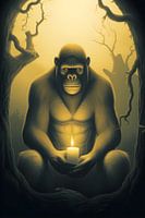 Dit betoverende digitale kunstwerk toont een krachtige en mystieke gorilla badend in de gouden gloed van een kaars. Tegen de achtergrond van een betoverd bos straalt de gorilla een kalme maar imposante aanwezigheid uit, als symbool van wijsheid en kracht. Het spel van licht en schaduw benadrukt de complexe details van de gespierde…