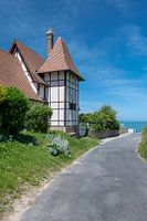 Een vakwerkhuis aan het strand van de Cote d'Albatre, dat bekend is om zijn krijtrotsen.
