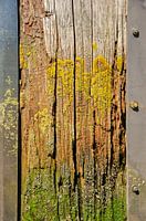 Een compostitie met zowel kaarsrechte als grillige verticale lijnen en van bruine, groene en grijze tinten. Een verweerde meerpaal in de haven, bedekt met korstnossen, ingeklemd in een stalen frame waaraan de tand des tijds ook niet helemaal ongemerkt is voorbij gegaan.