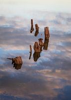 Rotte houten palen in stilstaand water weerspiegelen een zonsondergangshemel