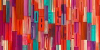 "Wooden Chaos" presenteert een levendige en gedurfde compositie van verticale houten panelen in verschillende tinten, die samen een dynamisch geheel vormen. De panelen, in schakeringen van paars, oranje, turquoise en dieprood, variëren in breedte en hoogte, wat zorgt voor een visuele spanning en ritme. De textuur van het hout is…