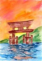 Aquarel van een houten tempelpoort of schrijn omringd door de vier elementen vuur, aarde, water en wind.