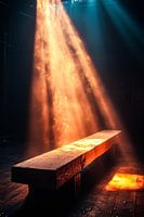 Dit ontwerp toont een unieke, sfeervolle setting waarin een eenvoudige houten balk opvalt door een krachtige lichtstraal. De warme tinten oranje en geel contrasteren prachtig met de donkere achtergrond, wat een mysterieuze en serene ambiance creëert. Perfect als decoratie voor minimalistische of moderne interieurs, dit beeld straalt rust en focus uit. Ideaal voor wie van eenvoudige, maar indrukwekkende kunst houdt.