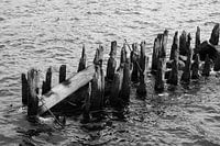 Houten balken met wrakhout ertussen steken uit het water van de Bodensee in zwartwit. Een sfeervol beeld genomen vanaf een steiger.