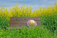 Houten bankje met zonnehoed midden in de natuur