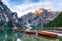 Houten boten langs de oever van de Pragser Wildsee, het Braies-meer, in de prachtige Dolomieten van Zuid-Tirol, Italië