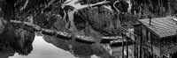 De Pragser Wildsee / Lago di Braies ligt schilderachtig genesteld aan de kant van torenhoge bergen, die op een windstille dag prachtig in het water worden weerspiegeld.