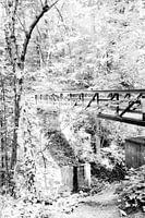 Een zwart-wit foto van een houten brug ergens in het zuiden van Limburg. Een erg rustgevende plek om te vertoeven.