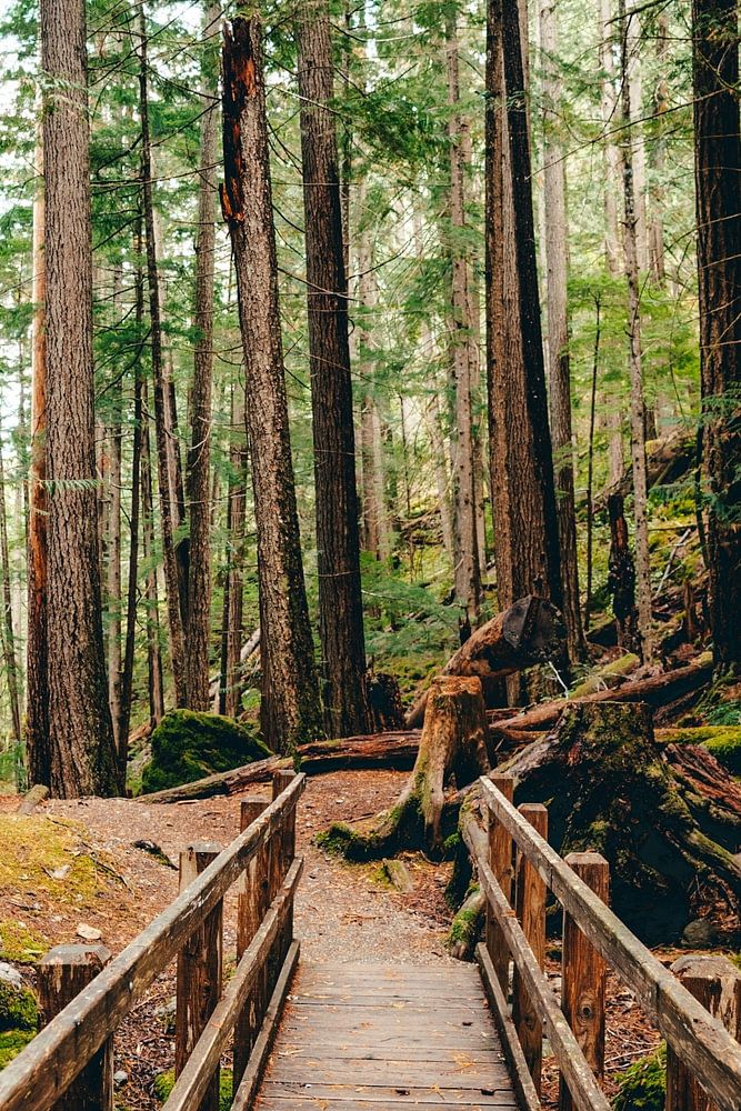 Deze reisfoto schoot ik in een regenwoud in Canada. Een donkere, houten brug loopt over een klein riviertje midden in het donkere bos. De foto heeft prachtige rijke groene, gele, oranje en bruine tinten. Ideale herfstfoto!