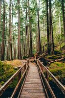 Deze reisfoto schoot ik in een regenwoud in Canada. Een donkere, houten brug loopt over een klein riviertje midden in het donkere bos. De foto heeft prachtige rijke groene, gele, oranje en bruine tinten. Ideale herfstfoto!