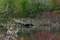 Dit prachtige doorkijkje kun je vinden in de heemtuin te Rucphen, Noord-Brabant. Het houten bruggetje wordt weerspiegelt in het heldere water.