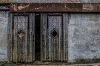 Vervallen en roestige schuifdeuren bij Fort Sabina in Nederland.