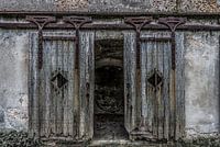 Vervallen en roestige schuifdeuren bij Fort Sabina in Nederland.