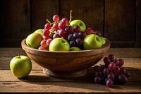 Dit is een digitaal kunstwerk van 1 rustieke houten fruitschaal staande op een antieke houten tafel. De fruitschaal is gevuld met rode druiven en groene appels. Het warme ochtendlicht werpt een gouden gloed op het geheel. Het is een sfeervol en romantisch beeld.