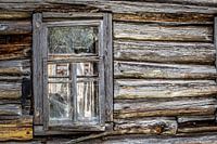 Een raam in een klein oud verlaten houten huis in de 30 km exclusion zone van de Tsjernobyl kernreactor in Wit Rusland.
