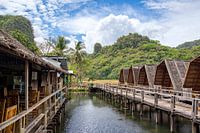 Tussen de jungle en karstbergen van Rammang Rammang National Park staan deze houten hutjes. Sulawesi eiland, Indonesië.