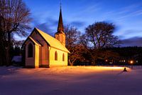 De oude houten kerk op een winternacht.
