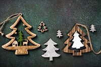 Overhead shoot van houten kerstbomen hangers en decoratie