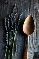 Oude houten lepel met lavendelbloemen op een rustieke houten achtergrond