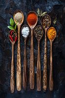 Deze prachtige foto toont een verzameling houten lepels, gevuld met diverse specerijen en kruiden. Van helder gele kurkuma tot kleurrijke peperkorrels en grove zoutkristallen, elk detail spreekt tot de verbeelding en brengt warmte in de keuken. De lepels, gemaakt van natuurlijk hout, hebben een rustieke uitstraling die perfect past in zowel moderne als landelijke interieurs. Dit ontwerp is ideaal om een vleugje karakter en smaak toe te voegen aan uw keukenwand of eetkamerdecoratie. De rijke kleuren en texturen geven het geheel een ambachtelijke uitstraling, die zowel culinaire liefhebbers als interieurdesignfans zal aanspreken.