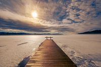 Houten loopbrug aan bevroren meer in hoog-Bavaria met zon en alpen op achtergrond