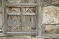Een houten luikje in een stenen muur. Digitaal bewerkt als een leuk schilderwerk.
